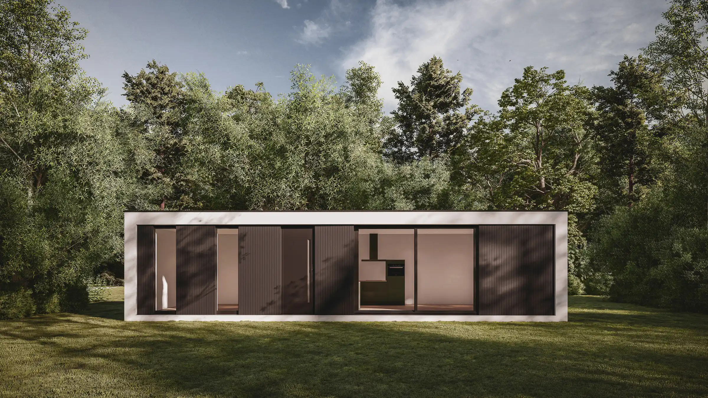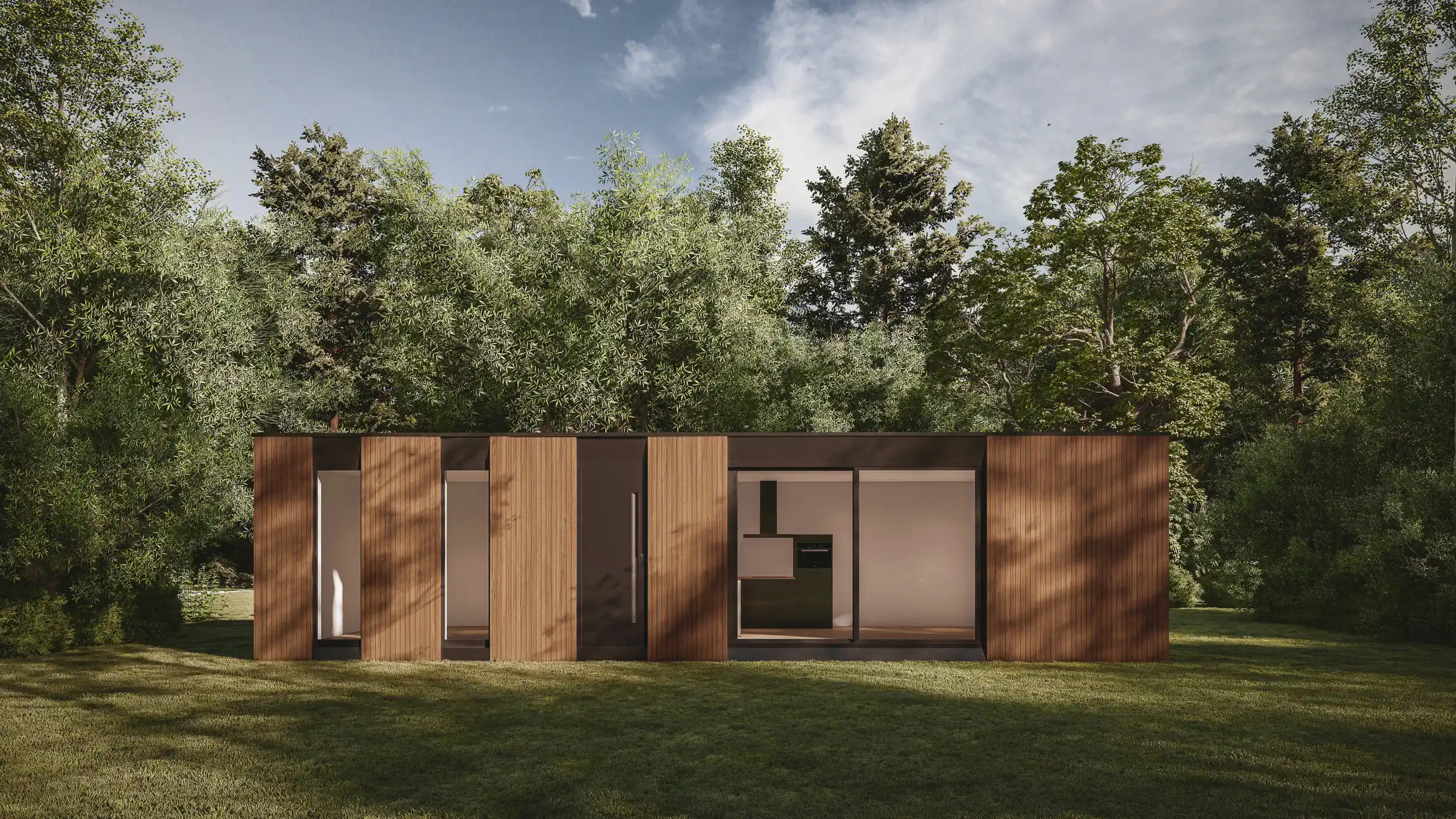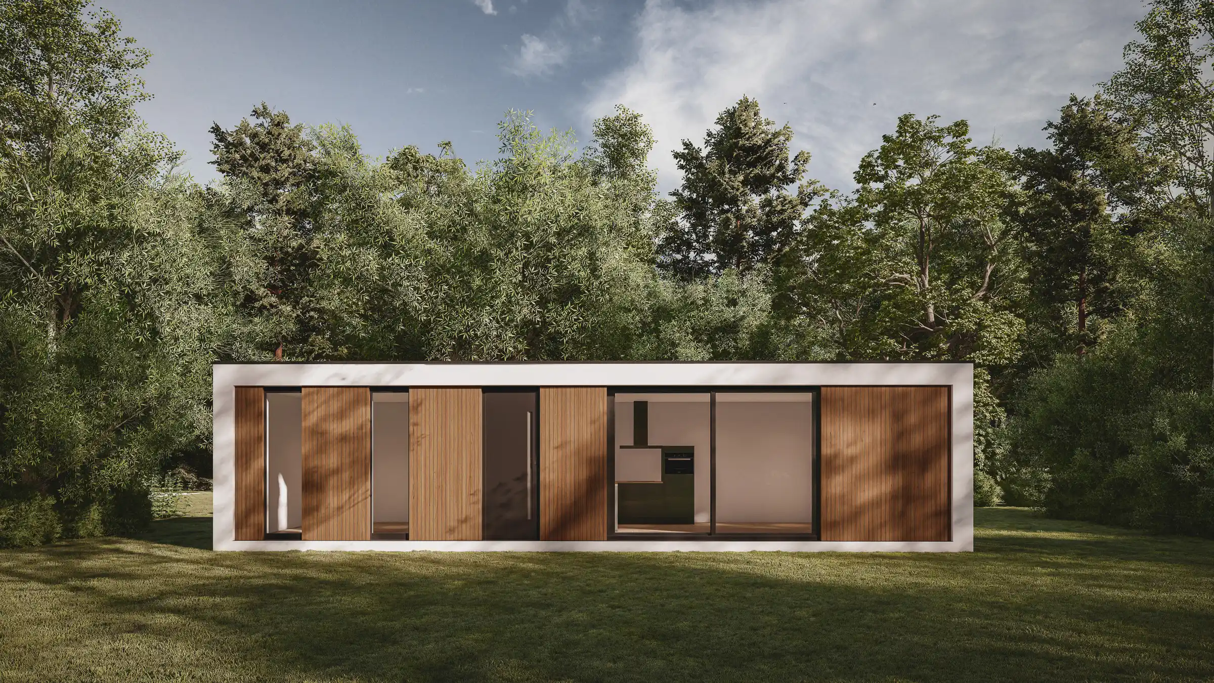 Verior L50 is ons grootste buitenverblijf. Deze beschikt over een ruime living met open keuken, schuifpui of openslaande tuindeuren, één of twee slaapkamers en aparte badkamer met toilet.